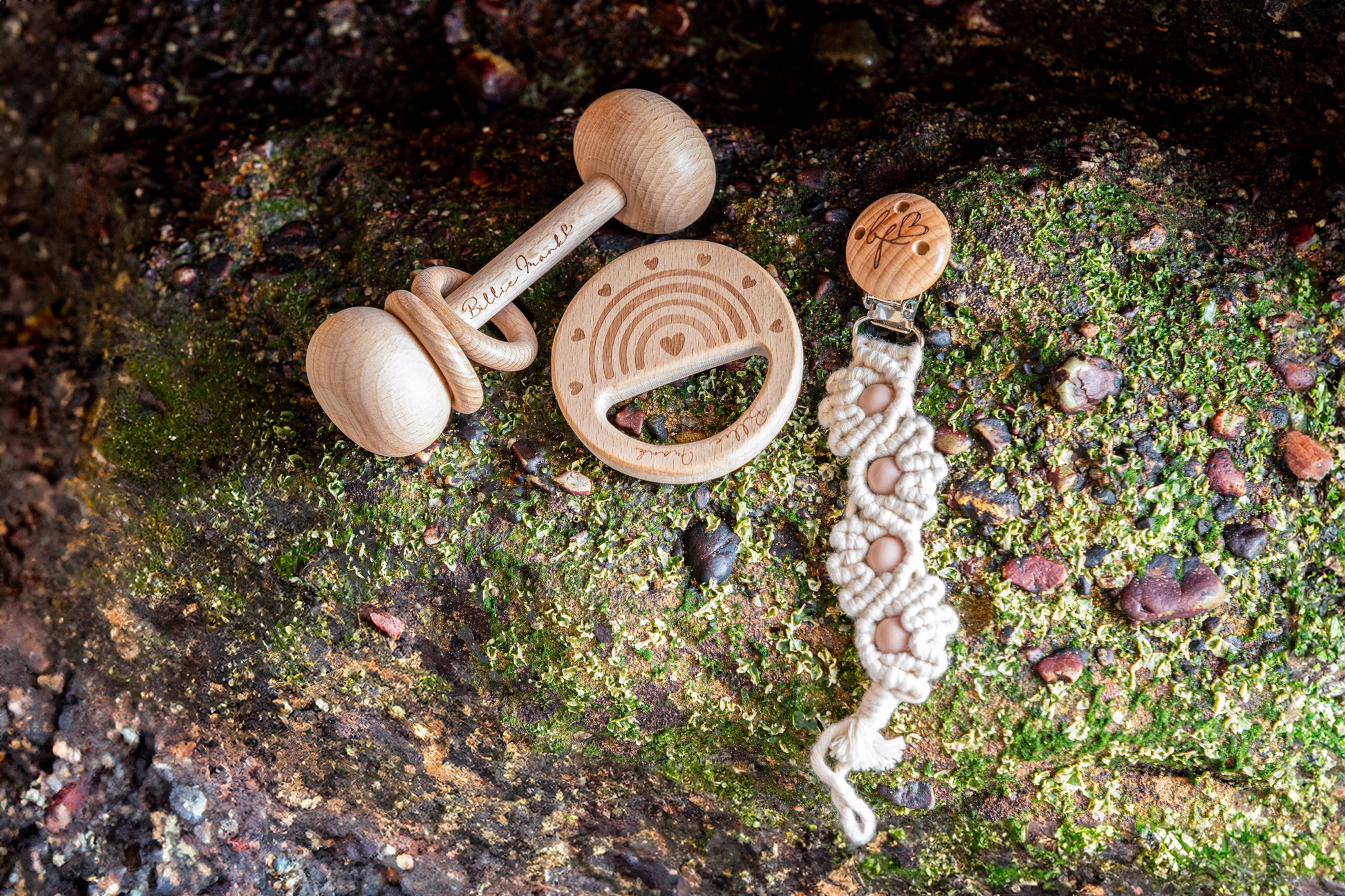 A beautifully crafted set of natural beechwood essentials—rattle, teether, and macrame dummy clip—designed for style, safety, and everyday charm.